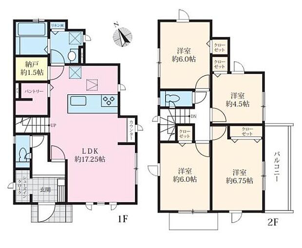 間取り内訳:リビングダイニングキッチン 17.2帖(1階)・洋室 6帖(2階)・洋室 4.5帖(2階)・洋室 6.7帖(2階)・洋室 6帖(2階)