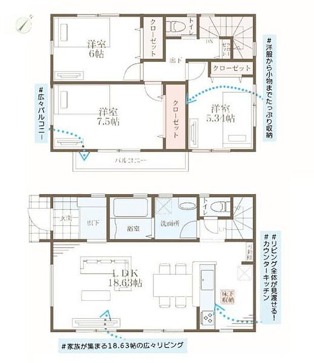 | 間取り | 3LDK 間取り内訳:リビングダイニングキッチン 18.6帖(1階)・洋室 6帖(2階)・洋室 7.5帖(2階)・洋室 5.3帖(2階) |