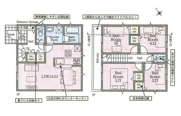 | 間取り | 3SLDK 間取り内訳:リビングダイニングキッチン 14.5帖(1階)・洋室 5帖(2階)・洋室 5.7帖(2階)・収納 3.7帖(2階)・洋室 4.5帖(2階) |