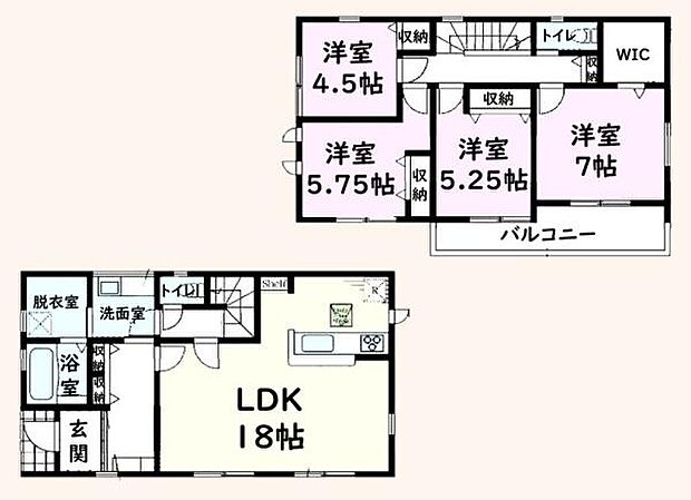 | 間取り | 4LDK 間取り内訳:リビングダイニングキッチン 18帖(1階)・洋室 7帖(2階)・洋室 5.7帖(2階)・洋室 5.2帖(2階)・洋室 4.5帖(2階) |