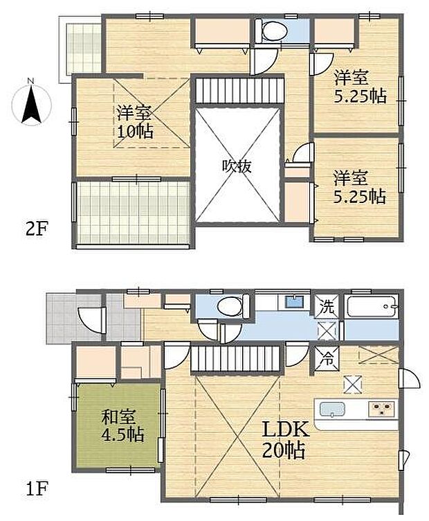 | 間取り | 4LDK 間取り内訳:リビングダイニングキッチン 20帖(1階)・和室 4.5畳(1階)・洋室 10帖(2階)・洋室 5.2帖(2階)・洋室 5.2帖(2階) |