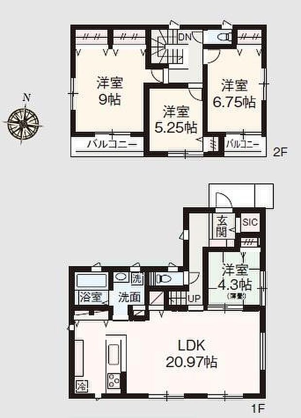 | 間取り | 4LDK 間取り内訳:洋室 6.7帖(2階)・リビングダイニングキッチン 20.9帖(1階)・洋室 4.3帖(1階)・洋室 9帖(2階)・洋室 5.2帖(2階) |