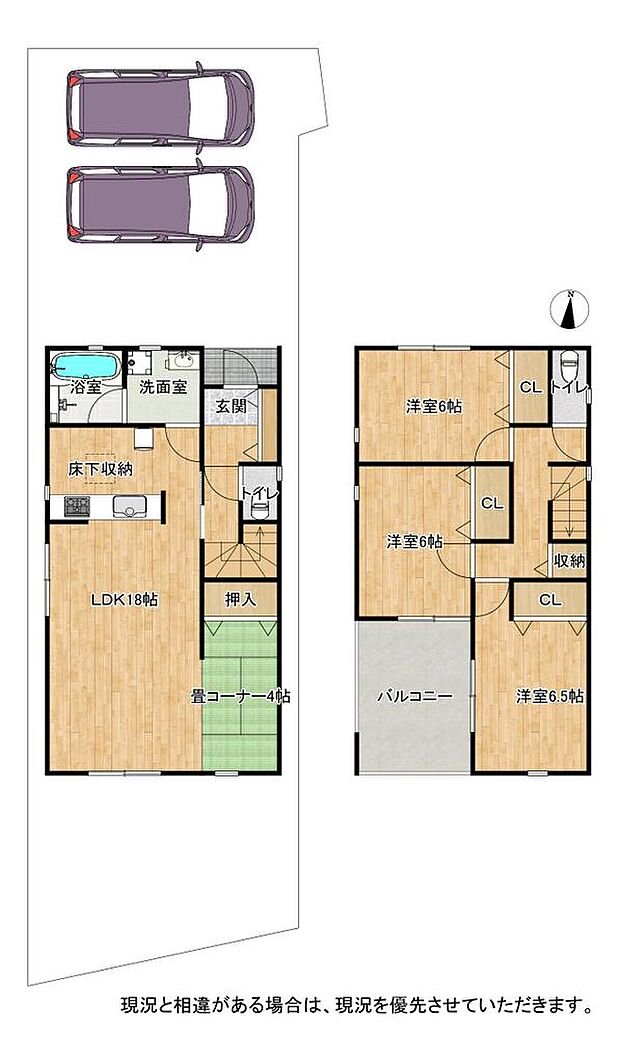 間取り内訳:リビングダイニングキッチン 18帖(1階)・和室 4畳(1階)・洋室 6.5帖(2階)・洋室 6帖(2階)x2
