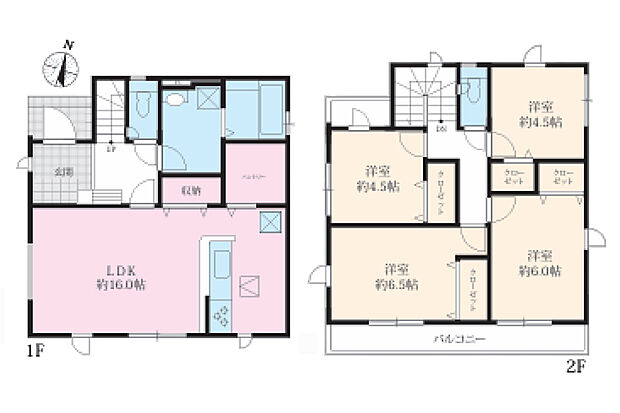 | 間取り | 4LDK 間取り内訳:リビングダイニングキッチン 16帖(1階)・洋室 6.5帖(2階)・洋室 6帖(2階)・洋室 4.5帖(2階)x2 |