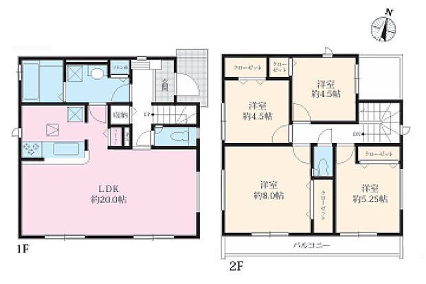 | 間取り | 4LDK 間取り内訳:洋室 5.2帖(2階)・洋室 4.5帖(2階)x2・リビングダイニングキッチン 20帖(1階)・洋室 8帖(2階) |
