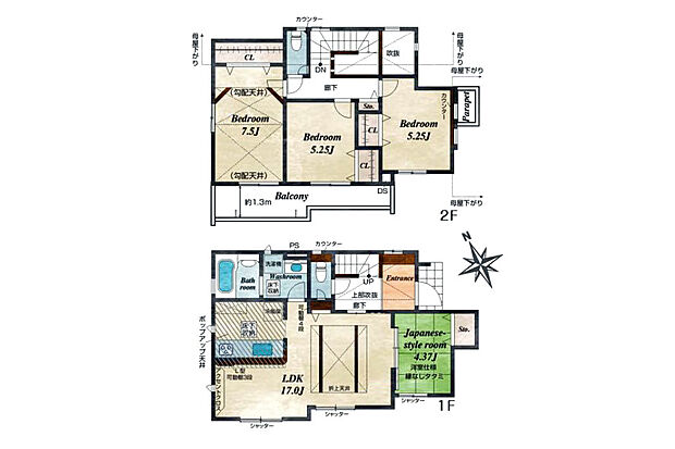 | 間取り | 4LDK 間取り内訳:リビングダイニングキッチン 17帖(1階)・和室 4.3畳(1階)・洋室 7.5帖(2階)・洋室 5.2帖(2階)x2 |