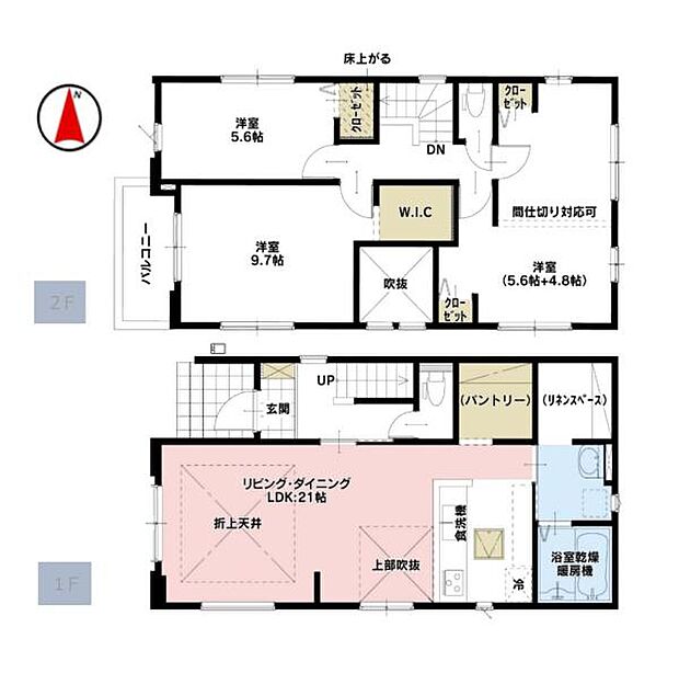 | 間取り | 3LDK 間取り内訳:リビングダイニングキッチン 21帖(1階)・洋室 5.6帖(2階)・洋室 9.7帖(2階)・洋室 10.4帖(2階) |