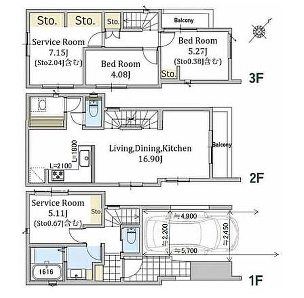 | 間取り | 2SLDK 間取り内訳:収納 5.1帖(1階)・リビングダイニングキッチン 16.9帖(2階)・収納 7.1帖(3階)・洋室 4帖(3階)・洋室 5.2帖(3階) |