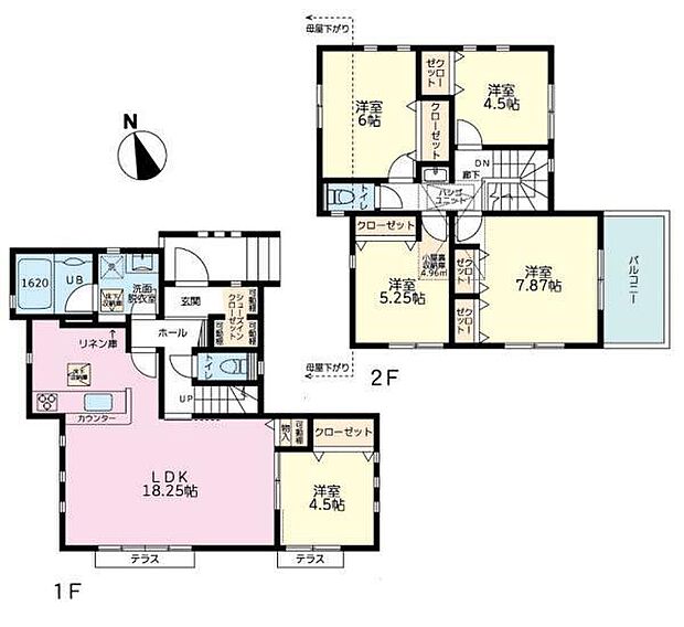 間取り内訳:リビングダイニングキッチン 18.2帖(1階)・洋室 4.5帖(1階)・洋室 6帖(2階)・洋室 5.2帖(2階)・洋室 7.8帖(2階)・洋室 4.5帖(2階)