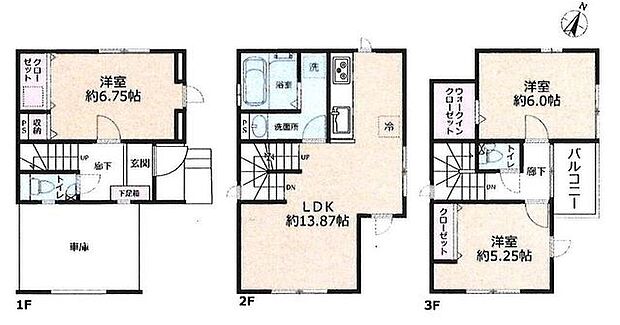 | 間取り | 3LDK 間取り内訳:リビングダイニングキッチン 13.8帖(2階)・洋室 6.7帖(1階)・洋室 6帖(3階)・洋室 5.2帖(3階) |