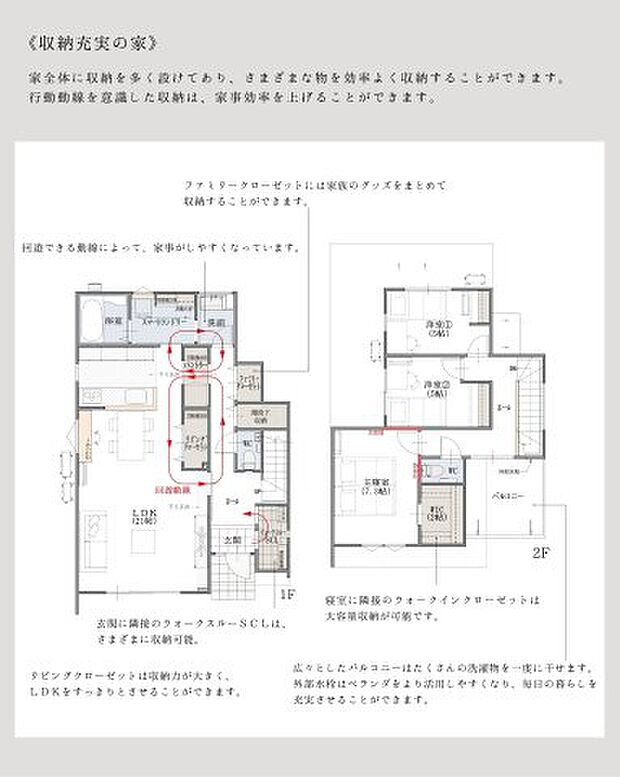 ●家全体に収納を多く設けてあり、さまざまな物を効率よく収納することができます。 行動動線を意識した収納は、家事効率を上げることができます。 ●南向きバルコニーのある2階は明るく、心地よいプライベート空間。