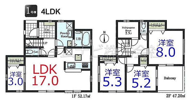| 間取り | 4SLDK 間取り内訳:リビングダイニングキッチン 17帖(1階)・洋室 3帖(1階)・洋室 8帖(2階)・洋室 5.3帖(2階)・洋室 5.2帖(2階)・収納 2.5帖(2階) |