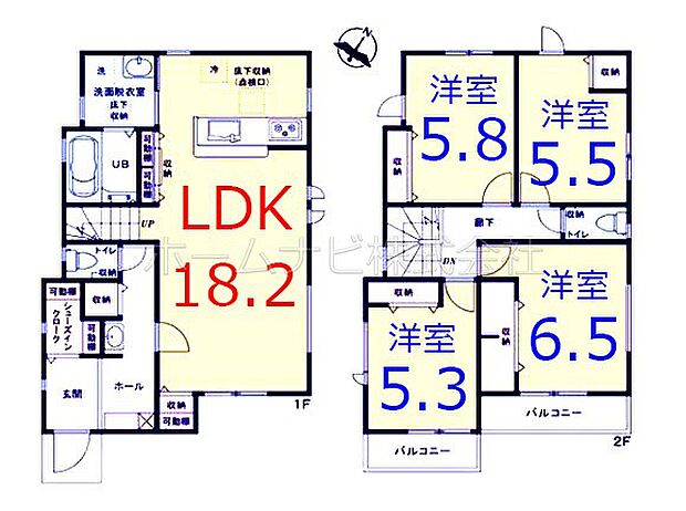 間取り内訳:リビングダイニングキッチン 18.2帖(1階)・洋室 6.5帖(2階)・洋室 5.8帖(2階)・洋室 5.5帖(2階)・洋室 5.3帖(2階)