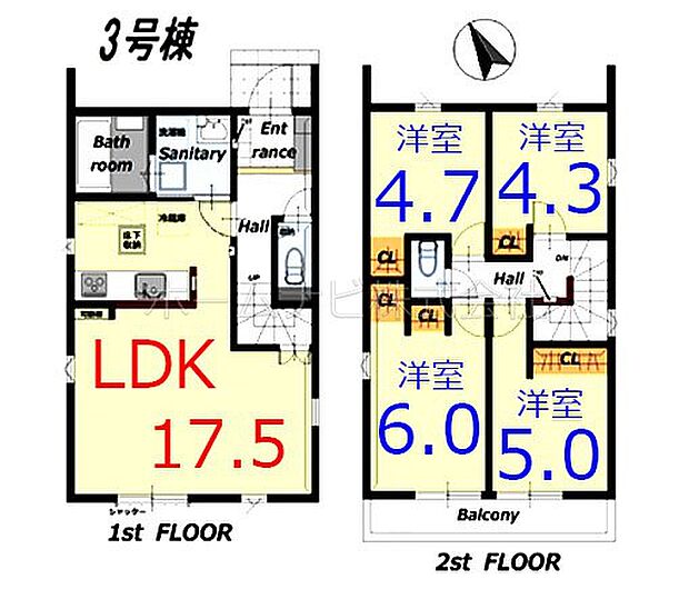 間取り内訳:リビングダイニングキッチン 17.5帖(1階)・洋室 6帖(2階)・洋室 5帖(2階)・洋室 4.7帖(2階)・洋室 4.3帖(2階)
