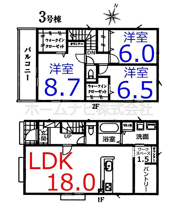 間取り内訳:リビングダイニングキッチン 18帖(1階)・洋室 8.7帖(2階)・洋室 6.5帖(2階)・洋室 6帖(2階)