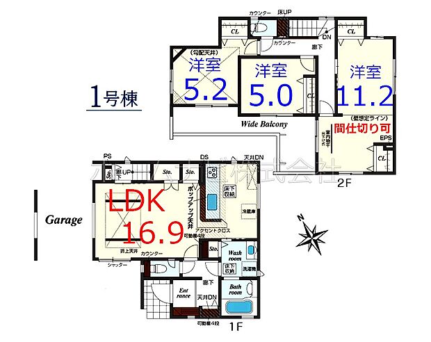 | 間取り | 3LDK(間仕切りで 4LDKに対応可能です。) 間取り内訳:リビングダイニングキッチン 16.9帖(1階)・洋室 11.2帖(2階)・洋室 5.2帖(2階)・洋室 5帖(2階) |