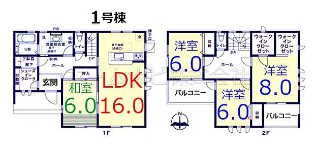 | 間取り | 4LDK 間取り内訳:リビングダイニングキッチン 16帖(1階)・和室 6畳(1階)・洋室 8帖(2階)・洋室 6帖(2階)・洋室 6帖(2階) |
