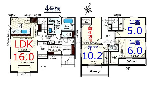 | 間取り | 3LDK(間仕切りで 4LDKに対応可能です。) 間取り内訳:リビングダイニングキッチン 16帖(1階)・洋室 10.2帖(2階)・洋室 6帖(2階)・洋室 5帖(2階) |