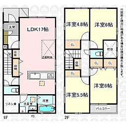 | 間取り | 4LDK(1階のLDKは 間仕切り対応可能です。WICがあります。) 間取り内訳:リビングダイニングキッチン 17帖(1階)・洋室 4.8帖(2階)・洋室 6帖(2階)・洋室 5.5帖(2階)・洋室 6帖(2階) |