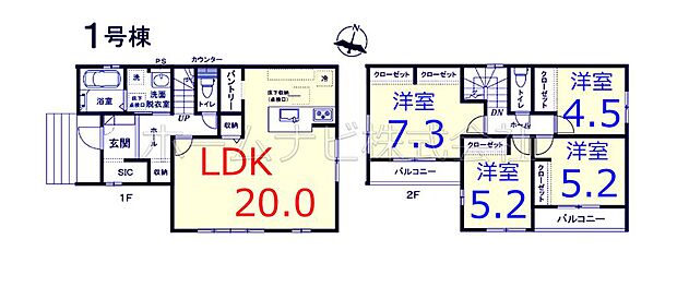 | 間取り | 4LDK(1階のキッチン横にパントリーがあります。) 間取り内訳:リビングダイニングキッチン 20帖(1階)・洋室 7.3帖(2階)・洋室 5.2帖(2階)・洋室 5.2帖(2階)・洋室 4.5帖(2階) |
