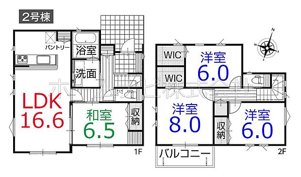 間取り内訳:リビングダイニングキッチン 16.6帖(1階)・和室 6.5畳(1階)・洋室 8帖(2階)・洋室 6帖(2階)・洋室 6帖(2階)