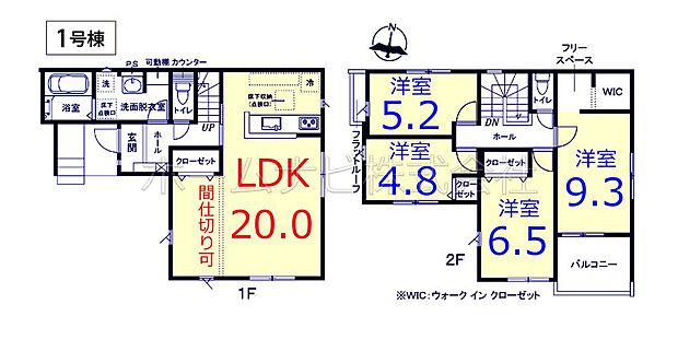 | 間取り | 4LDK(1階のLDKは 間仕切り対応可能です。WICがあります。) 間取り内訳:リビングダイニングキッチン 20帖(1階)・洋室 9.3帖(2階)・洋室 6.5帖(2階)・洋室 5.2帖(2階)・洋室 4.8帖(2階) |
