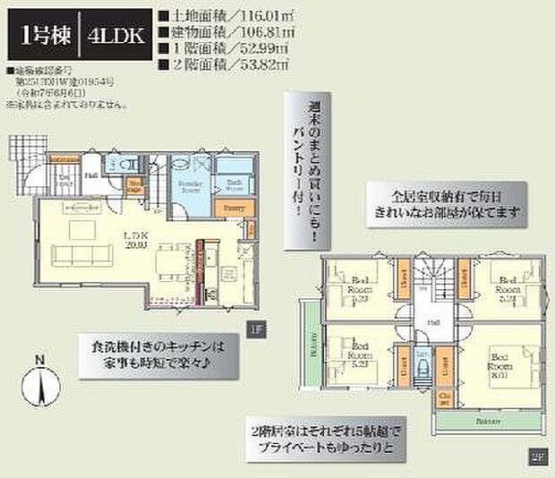 | 間取り | 4LDK 間取り内訳:リビングダイニングキッチン 20帖(1階)・洋室 8帖(2階)・洋室 5.2帖(2階)・洋室 5.2帖(2階)・洋室 5.2帖(2階) |