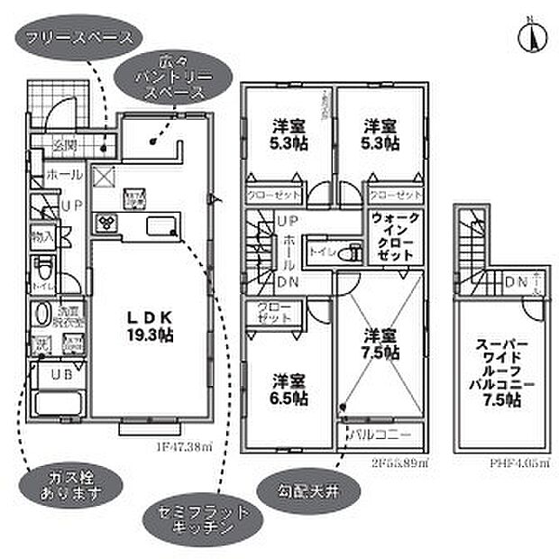 | 間取り | 4LDK 間取り内訳:リビングダイニングキッチン 19.3帖・洋室 7.5帖・洋室 6.5帖・洋室 5.3帖・洋室 5.3帖 |