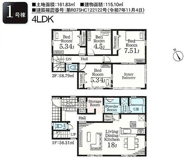 | 間取り | 4LDK(LDK 18.0畳 洋 7.5畳 洋 5.3畳 洋 4.5畳) 間取り内訳:洋室 7.5帖(2階)・洋室 5.3帖(2階)・洋室 4.5帖(2階)・洋室 5.3帖(2階)・リビングダイニングキッチン 18帖(1階) |