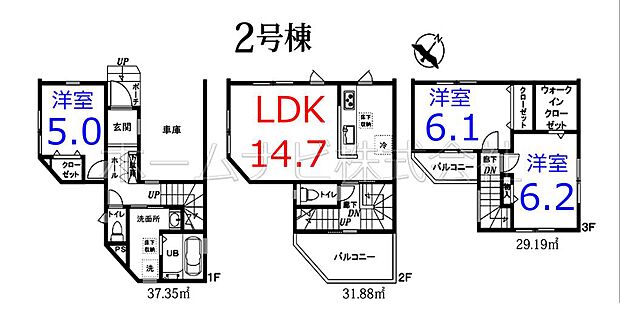 | 間取り | 3LDK 間取り内訳:洋室 5帖(1階)・リビングダイニングキッチン 14.7帖(2階)・洋室 6.2帖(3階)・洋室 6.1帖(3階) |