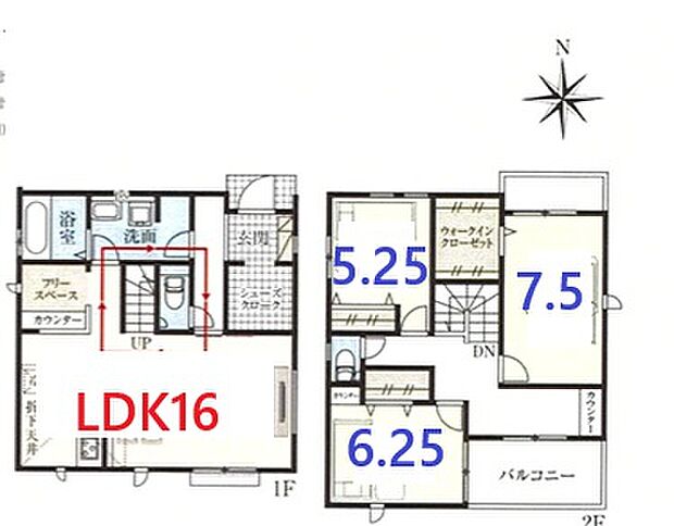 間取り内訳:リビングダイニングキッチン 16帖(1階)・洋室 5.2帖(2階)・洋室 7.5帖(2階)・洋室 6.2帖(2階)