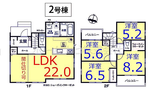 | 間取り | 4LDK 間取り内訳:リビングダイニングキッチン 22帖(1階)・洋室 8.2帖(2階)・洋室 6.5帖(2階)・洋室 5.6帖(2階)・洋室 5.2帖(2階) |