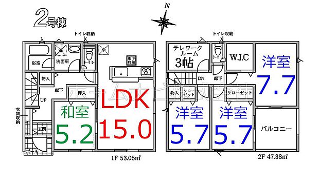 | 間取り | 4SLDK(2階に テレワークルーム3.0帖があります。) 間取り内訳:リビングダイニングキッチン 15帖(1階)・和室 5.2畳(1階)・洋室 7.7帖(2階)・洋室 5.7帖(2階)・洋室 5.7帖(2階)・収納 3帖(2階) |