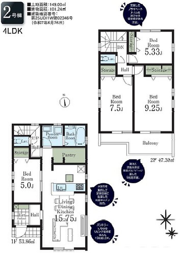 | 間取り | 4LDK 間取り内訳:リビングダイニングキッチン 15.7帖(1階)・洋室 5帖(1階)・洋室 9.2帖(2階)・洋室 7.5帖(2階)・洋室 5.3帖(2階) |