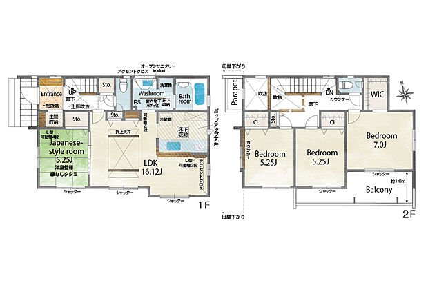 間取り内訳:リビングダイニングキッチン 16帖(1階)・洋室 7帖(2階)・洋室 5.2帖(2階)x2・和室 5.2畳(1階)