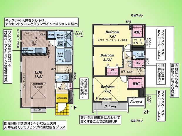カースペース2台可(車種による) 耐震等級3+制震ダンパー 長期優良住宅 設計住宅性能評価取得 太陽光発電 宅配ボックス リビング折り上げ天井 アクセントクロス 人造大理石カウンターシステムキッチン