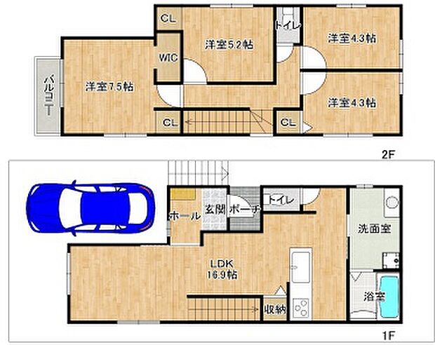 間取り内訳:洋室 5.2帖(2階)・洋室 7.5帖(2階)・リビングダイニングキッチン 16.9帖(1階)・洋室 4.3帖(2階)x2