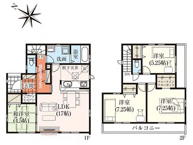 | 間取り | 4LDK 間取り内訳:リビングダイニングキッチン 17帖(1階)・和室 4.5畳(1階)・洋室 7.2帖(2階)・洋室 7.2帖(2階)・洋室 5.2帖(2階) |
