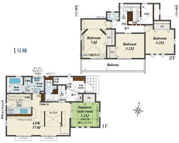 | 間取り | 4LDK 間取り内訳:リビングダイニングキッチン 17帖(1階)・和室 5.2畳(1階)・洋室 7帖(2階)・洋室 5.2帖(2階)・洋室 5.2帖(2階) |