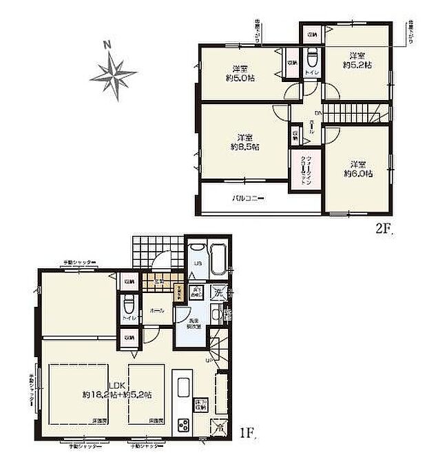 | 間取り | 4LDK 間取り内訳:リビングダイニングキッチン 23.4帖(1階)・洋室 5帖(2階)・洋室 8.5帖(2階)・洋室 6帖(2階)・洋室 5.2帖(2階) |