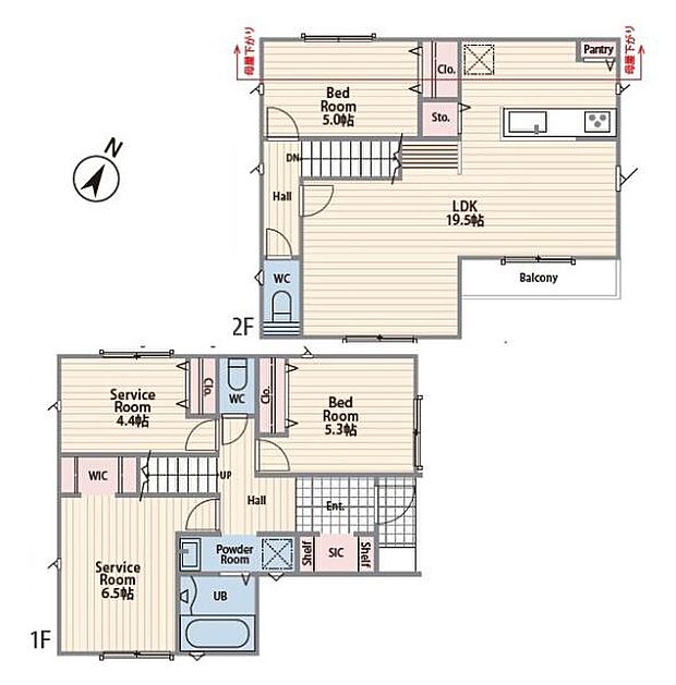 | 間取り | 2SLDK 間取り内訳:収納 4.4帖(1階)・収納 6.5帖(1階)・洋室 5.3帖(1階)・洋室 5帖(2階)・リビングダイニングキッチン 19.5帖(2階) |