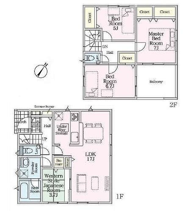 | 間取り | 3SLDK 間取り内訳:リビングダイニングキッチン 17帖(1階)・収納 3.7帖(1階)・洋室 5帖(2階)・洋室 7帖(2階)・洋室 6.7帖(2階) |