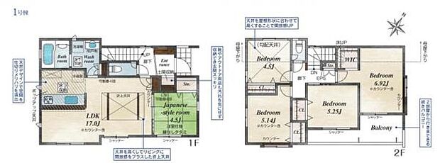 | 間取り | 5LDK 間取り内訳:リビングダイニングキッチン 17帖(1階)・和室 4.5畳(1階)・洋室 6.9帖(2階)・洋室 5.2帖(2階)・洋室 5.1帖(2階)・洋室 4.5帖(2階) |