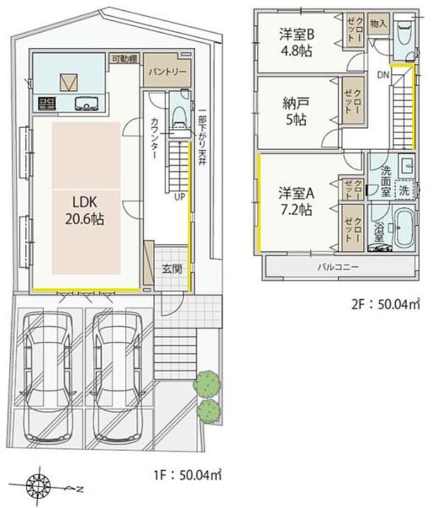 間取り内訳:リビングダイニングキッチン 20.6帖(1階)・洋室 7.2帖(2階)・洋室 4.8帖(2階)・収納 5帖(2階)