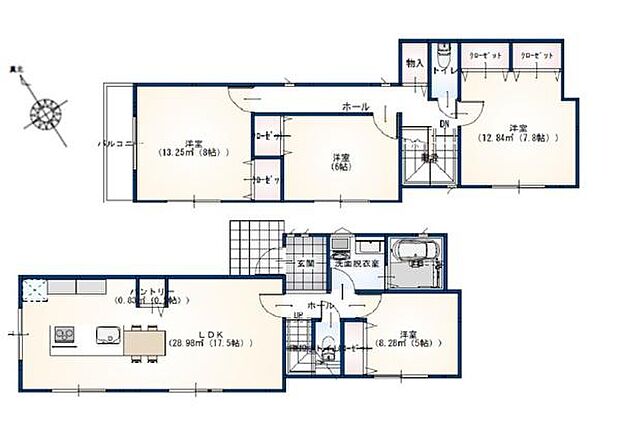 | 間取り | 4LDK 間取り内訳:リビングダイニングキッチン 17.5帖(1階)・洋室 5帖(1階)・洋室 8帖(2階)・洋室 6帖(2階)・洋室 7.8帖(2階) |