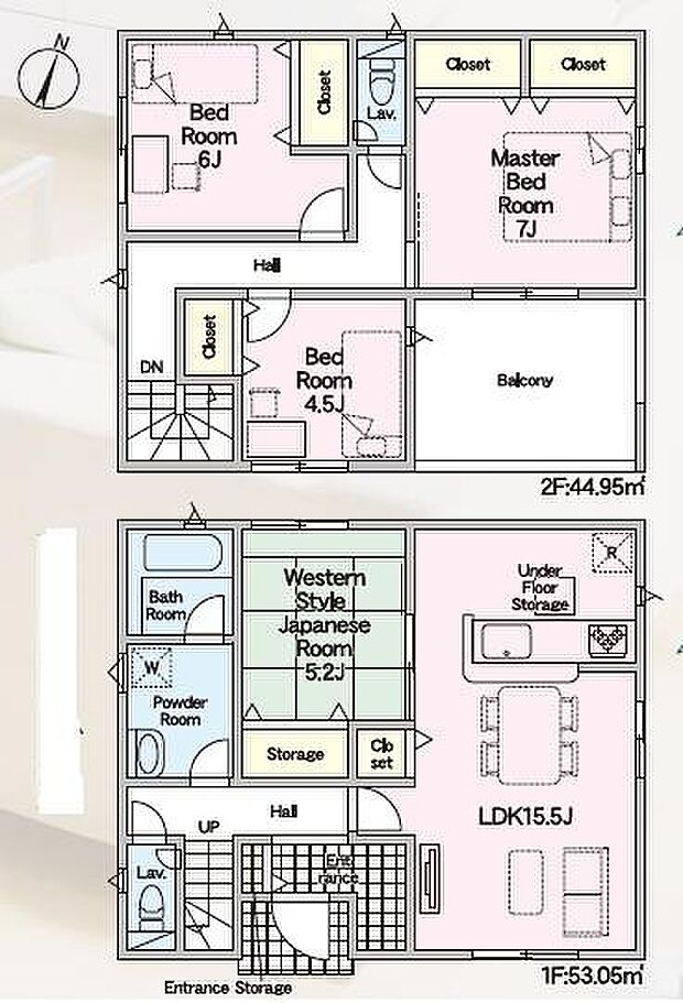 | 間取り | 4LDK 間取り内訳:リビングダイニングキッチン 15.5帖(1階)・和室 5.2畳(1階)・洋室 7帖(2階)・洋室 6帖(2階)・洋室 4.5帖(2階) |