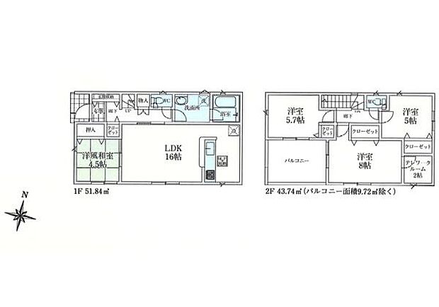 | 間取り | 4LDK 間取り内訳:リビングダイニングキッチン 16帖(1階)・和室 4.5畳(1階)・洋室 8帖(2階)・洋室 5.7帖(2階)・洋室 5帖(2階) |