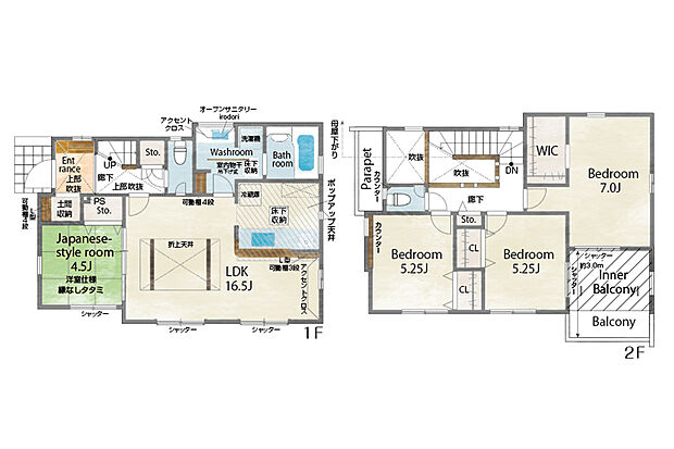 | 間取り | 4LDK 間取り内訳:リビングダイニングキッチン 16.5帖(1階)・洋室 7帖(2階)・洋室 5.2帖(2階)x2・和室 4.5畳(1階) |