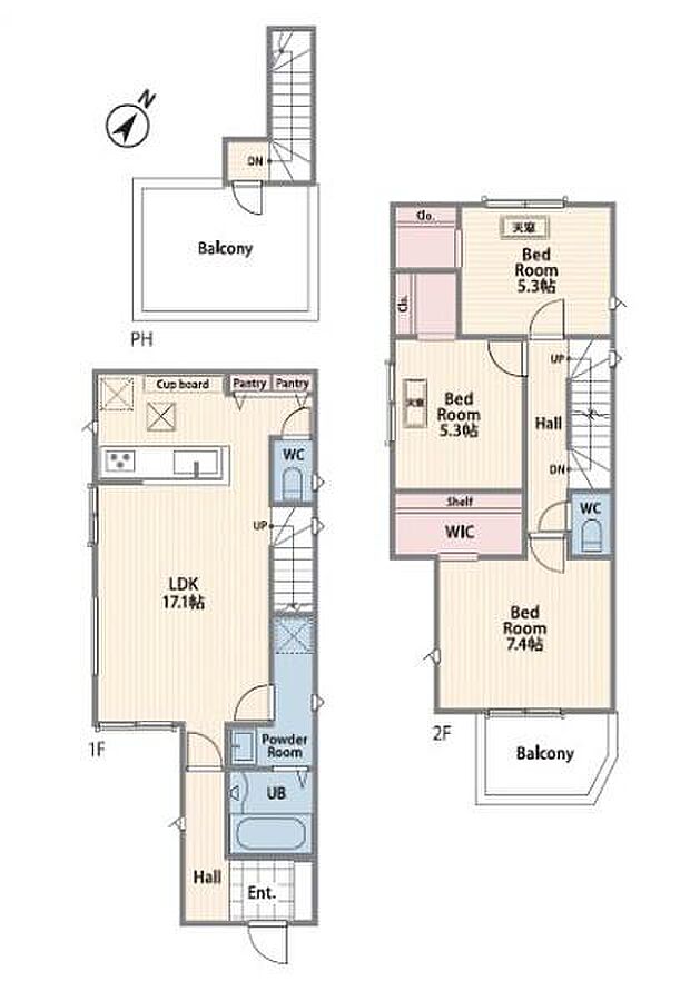 | 間取り | 3LDK 間取り内訳:リビングダイニングキッチン 17.1帖(1階)・洋室 5.3帖(2階)・洋室 5.3帖(2階)・洋室 7.4帖(2階) |
