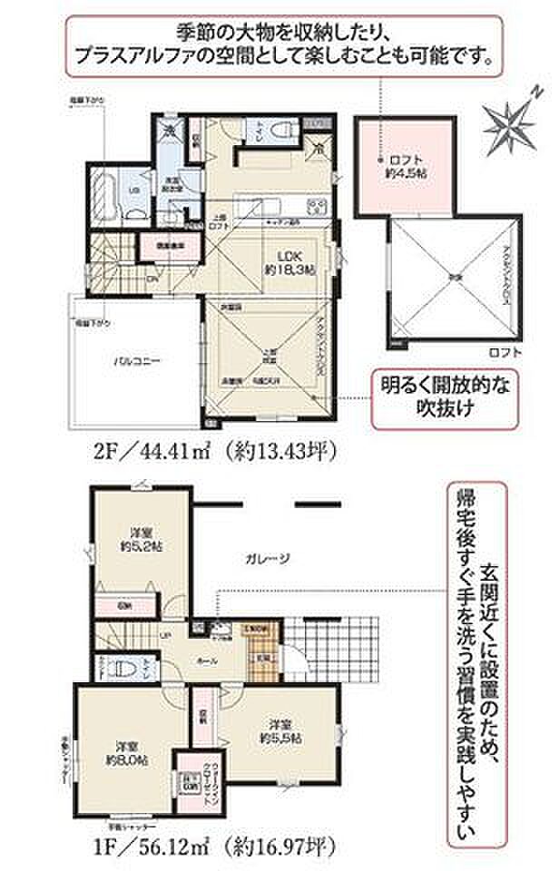 | 間取り | 3LDK 間取り内訳:リビングダイニングキッチン 18.3帖(2階)・洋室 8帖(1階)・洋室 5.5帖(1階)・洋室 5.2帖(1階)・その他 4.5帖 |
